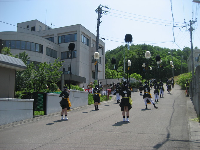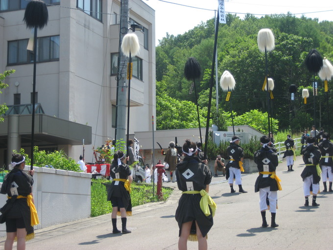 天気が良く、気温が高い中、例大祭の行列には小学生から一般の方まで70名が参加し、明治から続く伝統ある松前奴を塩谷地区で練り歩きました。