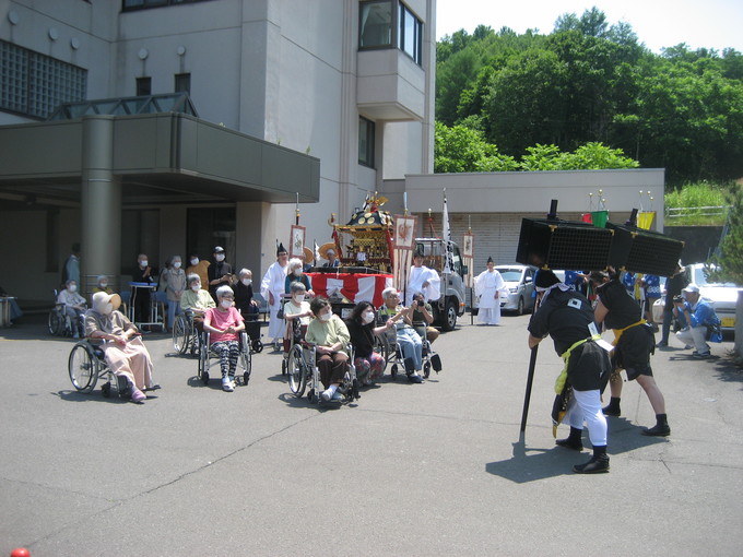 はまなすにも立ち寄って下さったので、入居者の方々はフロアの窓から眺めたり、正面玄関前で見学された方も居ました。外で見学された方々は、願い事が叶うよう天狗の鼻に触れたり、獅子に噛んでいただく人もおり、夏の思い出となるひと時を楽しんでおられました。
