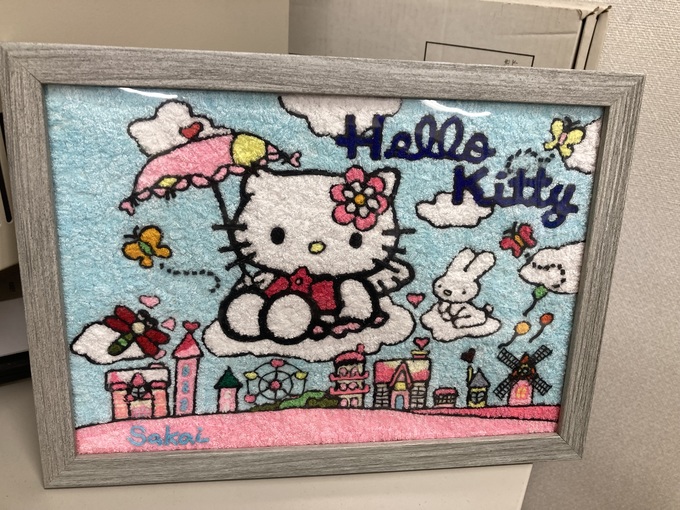先日、とてもうれしい事がありました。通所リハビリをご利用の方から、「好きなキャラクターは?」と聞かれ、答えてから暫く経ったある日、素敵なプレゼントを頂きましたので掲載します。写真では分からないと思いますが、刺繍糸を細かく切り、台紙にのりを付け貼っているそうです。リハビリの一環で行っているようですが、とても素敵な作品です。