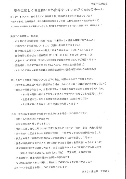 安全に楽しくお見舞いや外出等をしていただくためのルールについて